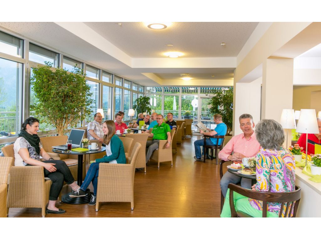Unsere modern gestaltete Cafeteria mit gemütlicher Sonnenterrasse und herrlichem Blick in die Ammergauer Alpen befindet sich in der Nähe des Haupteingangs und lädt zum entspannten Verweilen und Genießen ein.